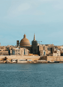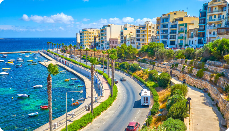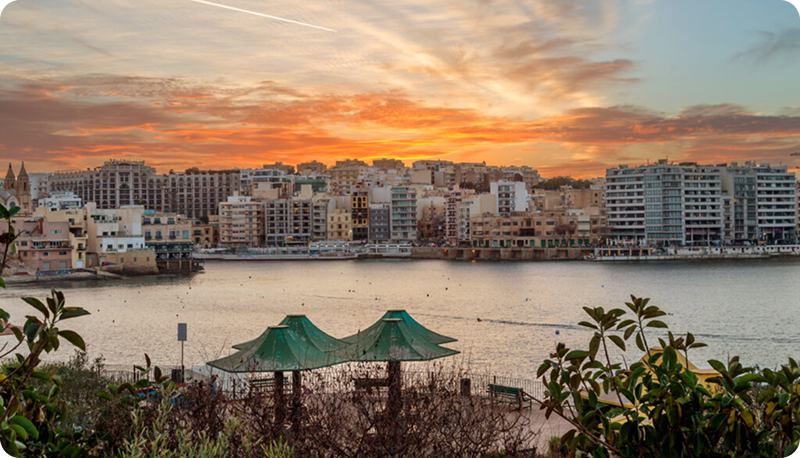 A vibrant view of Sliema and St. Julian’s, where sleek modern architecture meets the sparkling Mediterranean coastline in one of Malta’s most dynamic urban landscapes.